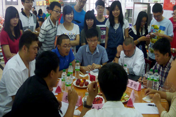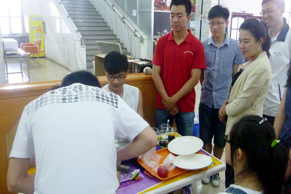 制作结束后,各支队伍依次将作品呈给各评委老师们品尝鉴定。评委老师们对那些菜名响亮、制作精巧、口感舒适的菜肴赞不绝口。“甜蜜长久”、“昭君出塞”、“群英荟萃”等作品都获得了评委们的好评。尤其是A组6号队伍的作品“东北一家人”博得了各评委老师的一致喝彩。李铁军主任点评道:“这道菜刀工细腻,菜名起得也很有创意,能用简单的食材做出这么鲜美可口的菜着实不易。”最终,九支队伍成功晋级下一轮的比赛。