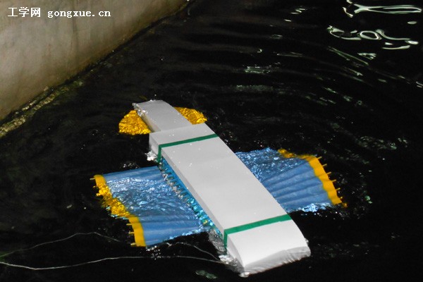 另一个“基于TRIZ理论的水下波动式推进装置”,由我院徐文华、彭玉祥等成员的团队组成。本作品力图用简约的机械传动实现灵活的运动。利用曲柄摇杆机构把齿轮的转动转换为杆的摆动,再让相邻的齿轮之间错动相同的角度,给杆一个初始的相位差,然后用膜把杆包络成曲面。当齿轮转动带动杆摆动时,由曲面形成的翼推动水往与运动相反的方向流动,从而使装置前进。