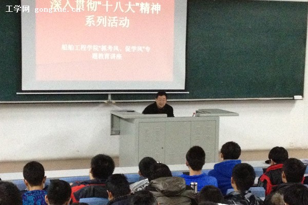 12月6日晚6点半,为响应学校党委关于学习“十八大”精神的号召,深入贯彻“十八大”精神,把科学发展观落到实处,结合本院实际,永乐高ylg030net开展深入贯彻“十八大”精神系列活动之“抓考风、促学风”专题教育活动。本次讲座由船舶学院党委书记韩伟主讲,党委副书记郭践识和2012级辅导员张学超老师及全体2012级同学参加了本次讲座。
