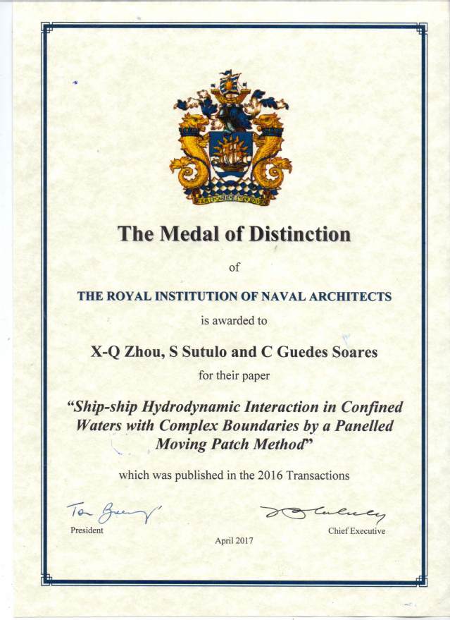 近日,英国皇家造船工程师学会公布2017年“卓越奖章(Medal of Distinction)”获奖名单,学院周学谦副教授和葡萄牙里斯本大学船舶与海洋工程技术中心S Sutulo教授和C Guedes Soares教授于2016年合作发表在《International Journal of Maritime Engineering》的论文《Ship-ship Hydrodynamic Interaction in Confined Water with Complex Boundaries by a Panelled Moving Patch Method》获奖。