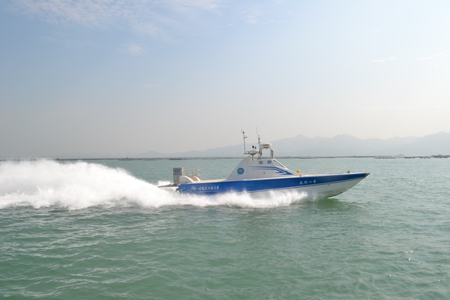 “天行一号”无人艇,全长12.2米,满载排水量7.5吨,配有油电混合动力系统,最高航速超过50节,最大航程1000公里。具有手操、遥控、半自主、全自主四种工作模式。全艇采用模块化设计,可根据需要快速更换任务载荷,自主完成海洋水文气象信息监测、海底地形地貌扫描测绘、首末端观测等多种任务。其先进的控制系统可实现对目标航迹的高精度跟踪,其环境认知系统采用先进的目标检测识别算法,结合实时建模技术,可对雷达、可见光、红外等多种传感器获取的环境目标信息进行快速融合处理,形成对周围环境信息的准确认知。在艇载自主决策系统的指导下可于任意适航水域高效完成多种任务使命,可针对复杂环境中的静态、动态障碍目标进行自主危险规避,以及对动态可疑目标进行自主跟踪追及。