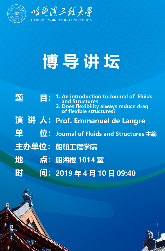 各位老师好,Journal of fluids and structures杂志主编Emmanuel de Langre教授将于4月10日上午9:40在船海楼1014会议室介绍Journal of fluids and structures杂志,并做题为Does flexibility always reduce drag of flexible structures?的学术讲座,欢迎各位老师参加。