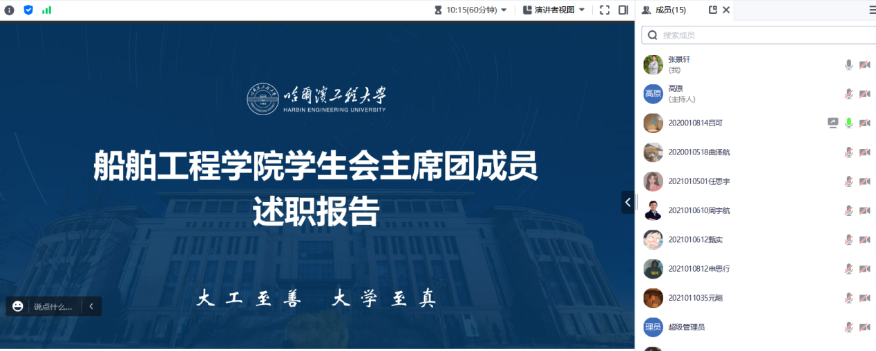 述职环节结束后,高原对本次活动进行总结。首先,高原对各主席团成员及各部门部长的工作成果给予肯定和鼓励;随后,针对学生会现存问题提出要提升学生会各部门凝聚力,加强交流合作,严格要求自己,做到从思想上到行动上的统一;最后希望学院的学生干部要谋事干事,善作善成,各部门要拧成一股绳,汇成一股流,继续做好未来工作,展现船舶学院学生干部的青春风采。