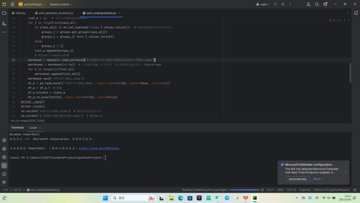 本次培训内容涵盖Python编程语言和PyCharm集成开发环境的基础知识和操作技巧。培训中,陈鹏为副部们介绍Python的基本语法、数据类型、条件语句、循环结构等基础知识,并结合实例进行演示和练习。同时,副部们深入学习PyCharm开发环境的使用方法,包括项目创建、代码编辑、调试技巧等内容。通过实际操作和案例分析,副部们将掌握使用Python和PyCharm处理青年大学习名单的具体步骤和技巧,为提高工作效率和数据处理质量奠定坚实基础。